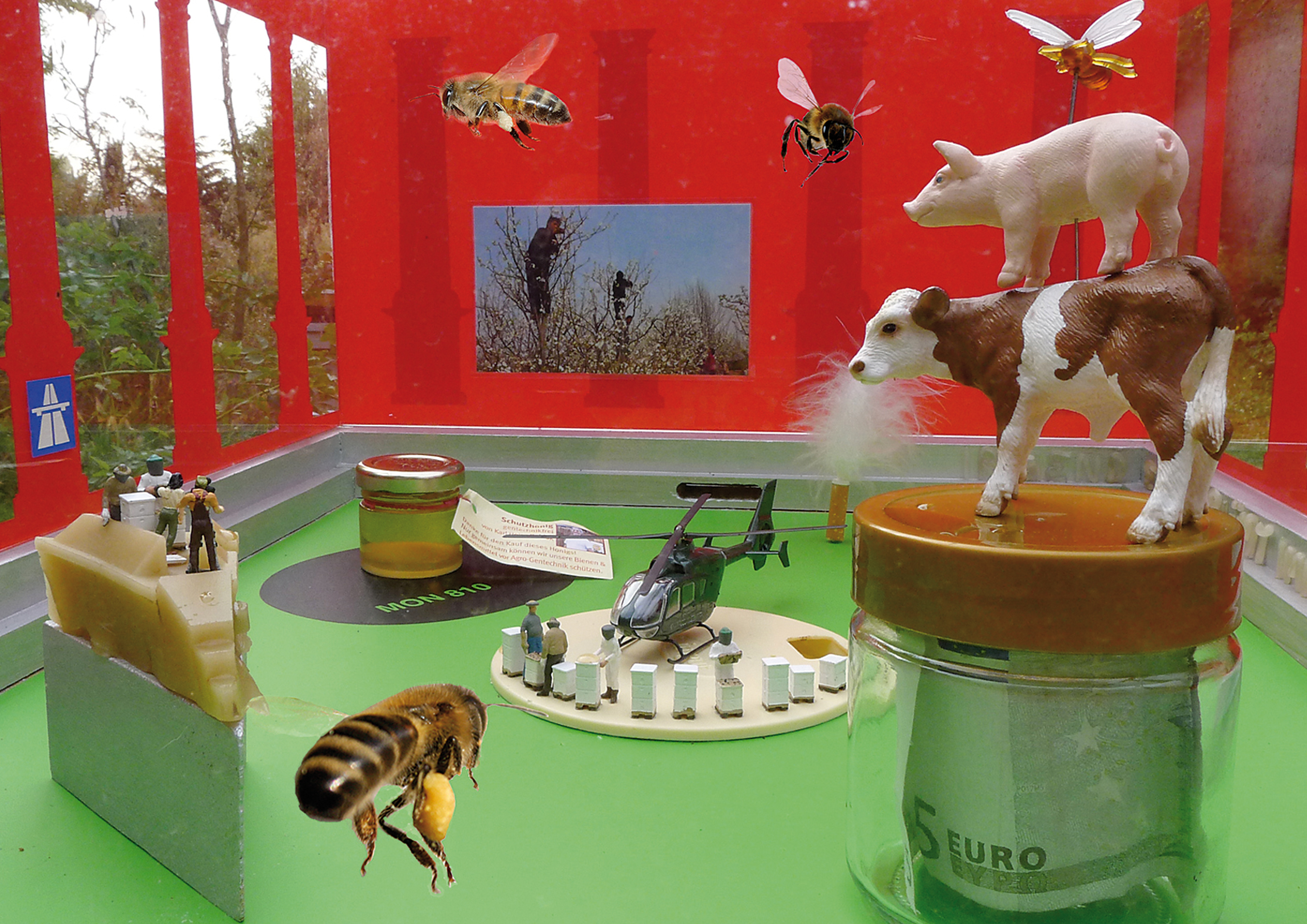 Die Sockel aller Mikromuseen bestehen aus Bienenkästen, aus denen unten die Bienenvölker ein- und ausfliegen. Darüber befindet sich das eigentliche Museum, ein Plexiglashaus, das zu den Öffnungszeiten von den Bienen aus dem unteren Stockwerk beflogen werden kann. Über den Honigverkauf finanzieren die Bienen ihr eigenes Museum, was unserer Arbeit als Museumsdirektoren eine finanzielle Autonomie verleiht.